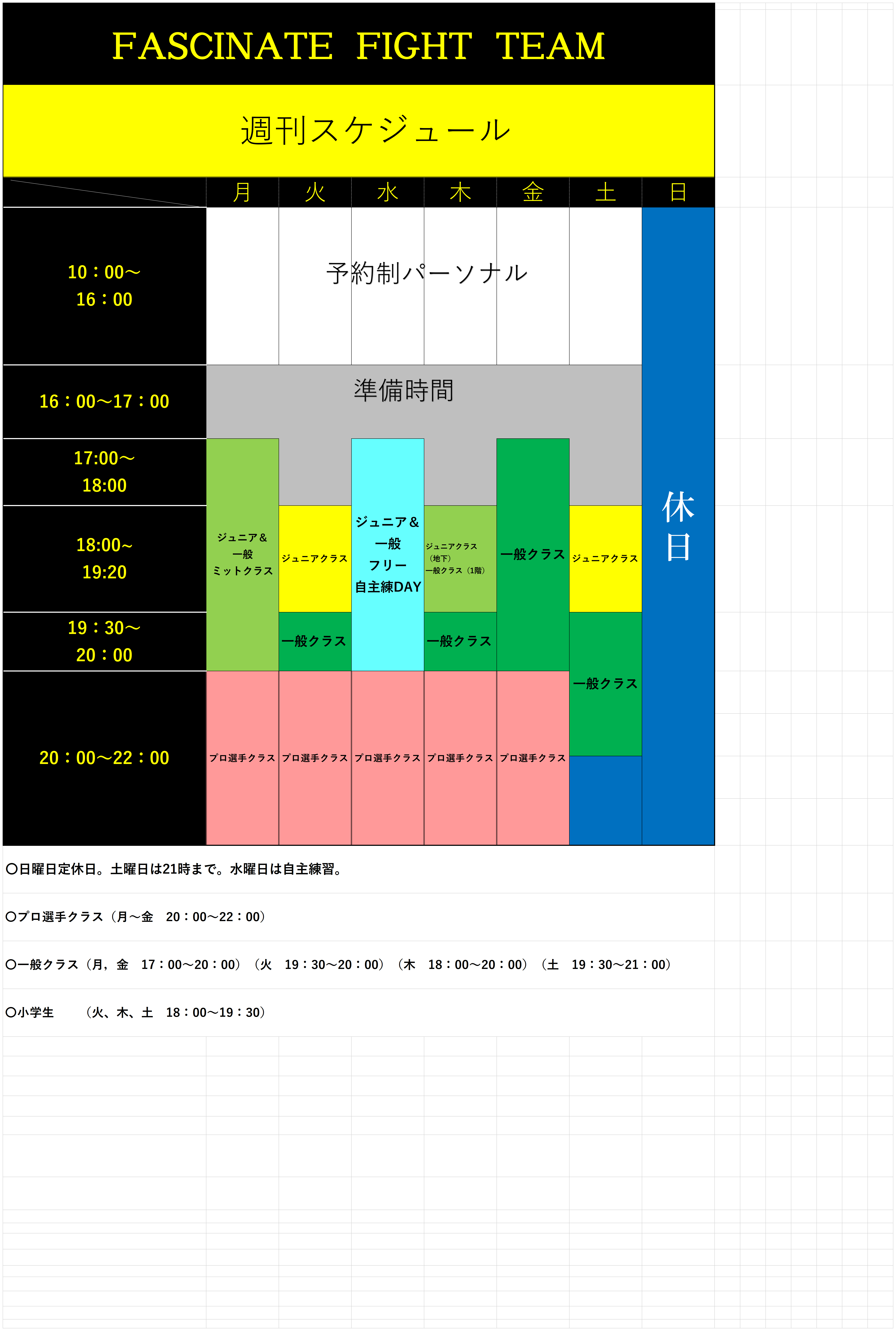 ■プロ志望者の練習は毎日20時~22時です。 ■小学生の練習は週3回です。(毎週 火、木、土曜日 18時~19時30分) ■中学生以上、一般の方は、フリークラスでミットやマススパーリングなどの練習をします。 :自主練DAYはリングやサンドバックなど、トレーニング用品を自由にお使いいただけます。 無料体験実施中! 無料体験の受付はこちら お問い合わせ